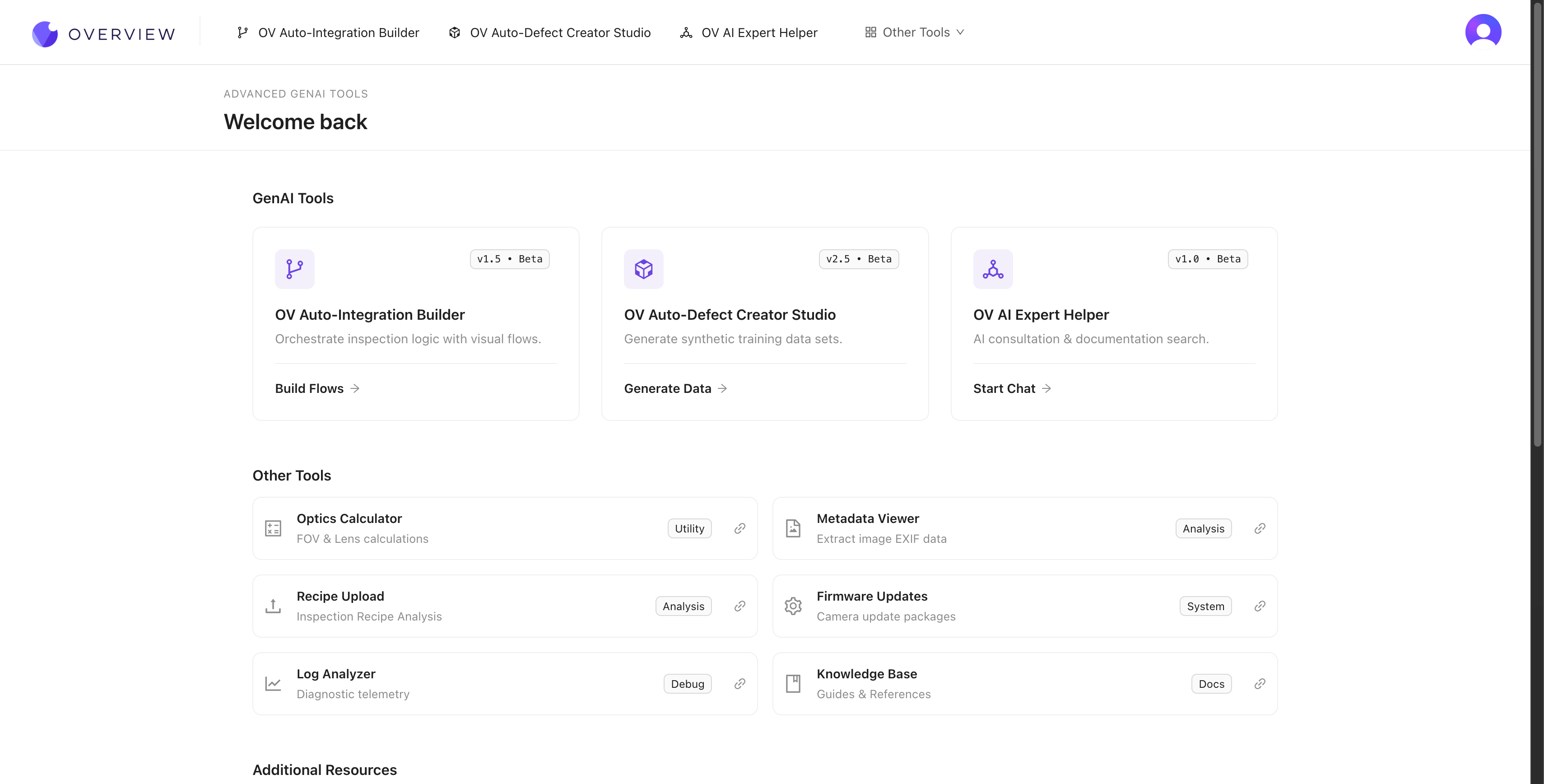 Tres herramientas impulsadas por IA en tools.overview.ai aceleran cada etapa de su flujo de inspección. Genere datos de entrenamiento sintéticos, cree integraciones de fábrica a partir de descripciones en inglés claro, y obtenga ayuda experta al instante, todo sin esperar tickets de soporte ni experiencia especializada. El panel también incluye seis herramientas utilitarias para cálculos ópticos, actualizaciones de firmware, diagnósticos y más.